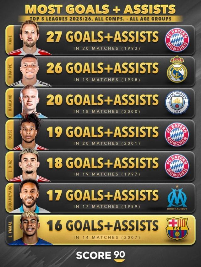 Score90统计了本赛季五大联赛球员参与进球数量,并列出榜单,凯恩27球居首。本赛季五大联赛球员参与进球榜(所有赛事):